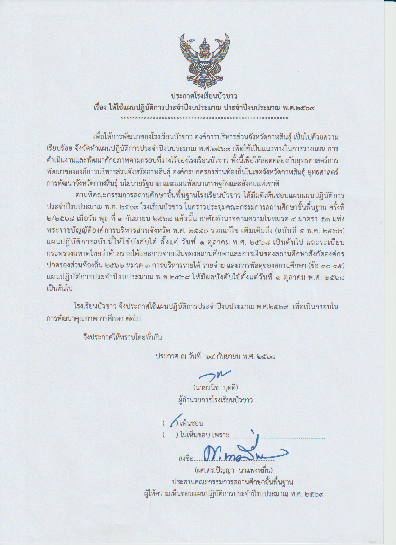 ประกาศโรงเรียนบัวขาว เรื่อง ให้ใช้แผนปฏิบัติการประจำปีงบประมาณ ประจำปีงบประมาณ 2569