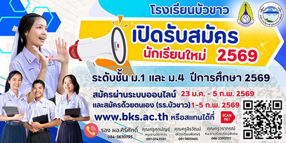 ♂ ประกาศรายชื่อผู้มีสิทธิ์สอบ วันที่ 18 กุมภาพันธ์ 2569 ณ เว็บไซต์โรงเรียนบัวขาว http://www.bks.ac.th